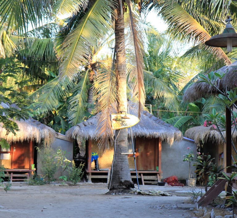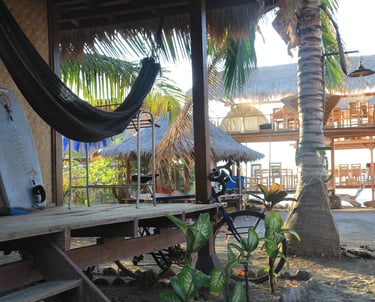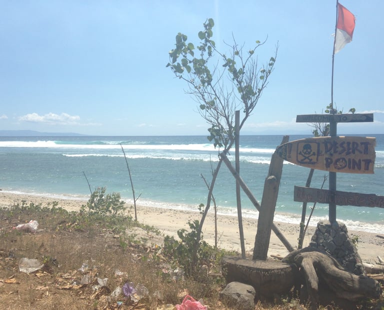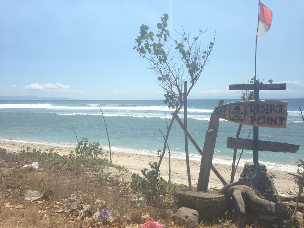 I make it over the hill, drink the last of my water. I creep down the hill, one foot on the ground and make it to the bottom where the shade of coconut trees great me. A small girl manning a boom gate stares at me, I asked her to open but she doesn’t. I ask how much and she says 10,000. I cycle along and about 200m I can see two 4wd and a half broken surfboard with desert point written on it. I made it to desert point by bike, 1.30pm.