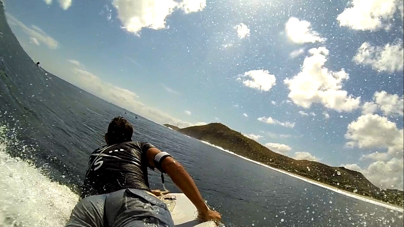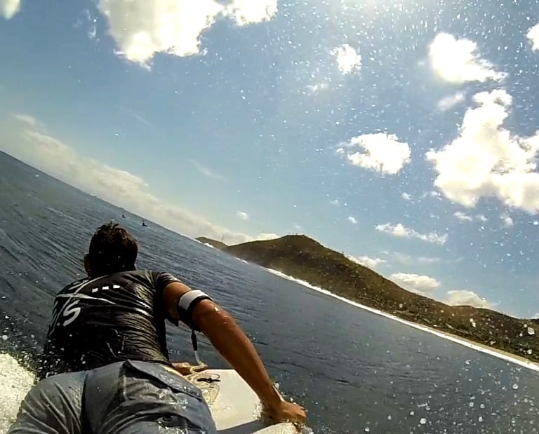 I find a losmen and notice my sandles are gone, o well barefoot it is. I drink about 3 litres of water, watch the surf, its about 5ft, barrelling but a bit windy. I psych myself up and hit the water with the gopro pole mount. Catch 2 ok waves before a surfer in front of me says he saw a fin. Another surfer says “I’m outer here, there are tiger sharks around here” I look out about 30m and don’t see a fin but do see something big in the water. Next wave im in and I hit the reef and tear my favoutire board shorts. What a day 83km.