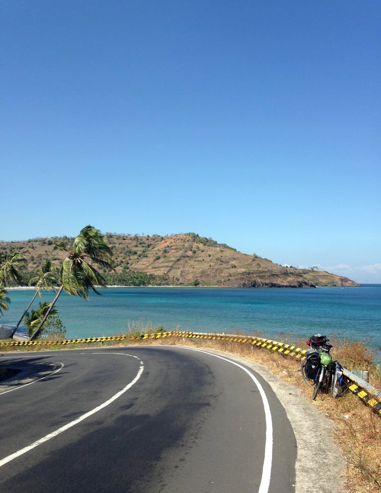 50km in and I start to reach awesome little coves with shite sanded beaches. The road surface is really good, sometimes smooth as anything, soft tar smooth. I pass little villages, google maps stops working so I navigate with a map and by asking people. Bangko Bangko is where I’m headed, Desert Point.